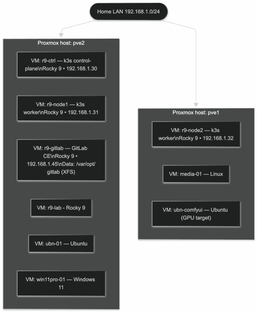 The first diagram is the “steel and wires” view: two Proxmox hosts on your 192.168.1.0/24 LAN, each carrying a tidy stack of VMs. pve2 is the busy one, home to the k3s control-plane (r9-ctrl at .30), the first worker (r9-node1 at .31), and your standalone GitLab VM (r9-gitlab at .45 with data mounted at /var/opt/gitlab). It also runs general-purpose boxes like an Ubuntu VM and a Windows VM. pve1 balances the other side with the second k3s worker (r9-node2 at .32), a media VM, and an Ubuntu machine earmarked for GPU/ComfyUI work. Everything sits on the same flat network so services are reachable without any NAT games, while GitLab stays outside the Kubernetes blast radius for easier upgrades and backups.