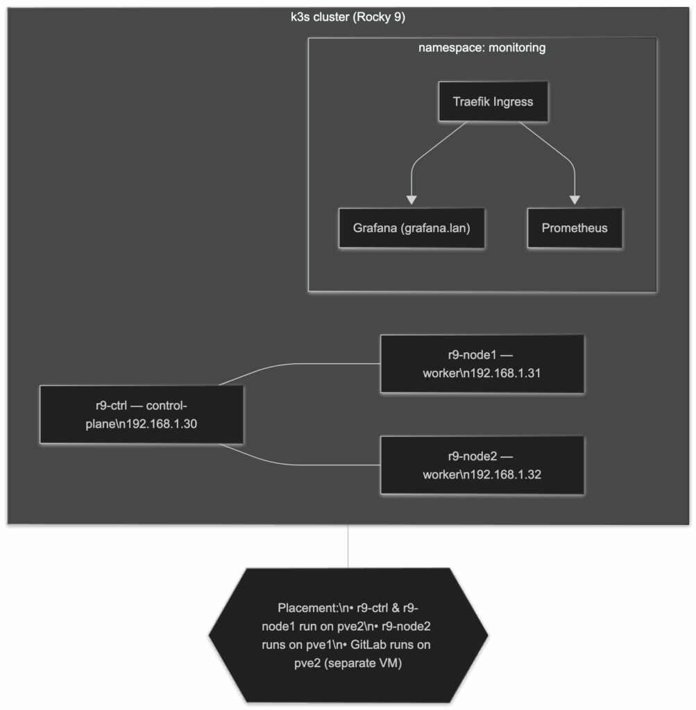 The cluster is one control-plane + two workers: control-plane on r9-ctrl, workers on r9-node1 and r9-node2. It’s the stock k3s stack (containerd runtime, flannel networking, ServiceLB). Monitoring is deployed in the monitoring namespace via kube-prometheus-stack: Prometheus, node-exporter, kube-state-metrics, and Grafana. Traefik is the ingress controller, and grafana.lan resolves to the Traefik ingress so the Grafana UI is reachable inside your LAN. All three nodes are reporting Ready, and Grafana/Prometheus are up behind the cluster IPs you listed.