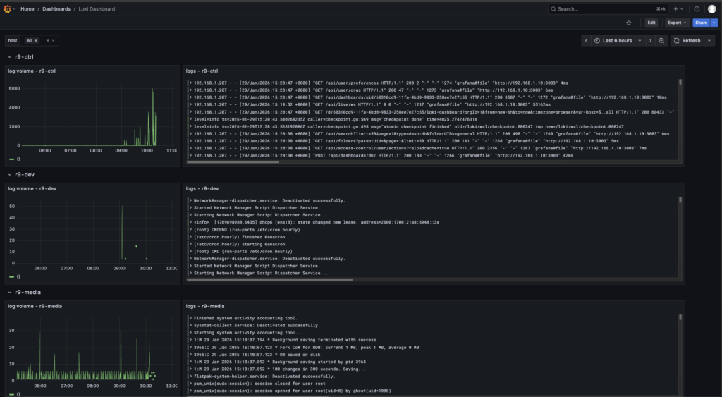 Centralized logging got built for one reason. chasing the same “what the hell just happened” clues across eight VMs is a great way to waste an evening and learn nothing useful. The goal was a single place to see what every node is doing in real time, with a quick activity chart and the actual log lines right next to it. Grafana lives at r9-ctrl:3003, and it’s pulling logs from eight Linux VMs total, five Rocky boxes and three Ubuntu boxes.